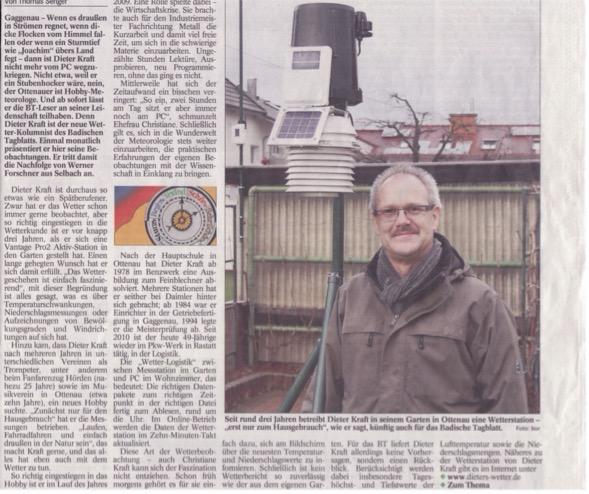 Gaggenau - Wenn es draußen in Strömen regnet, wenn dicke Flocken vom Himmel fallen oder wenn ein Sturmtief wie "Joachim" übers Land fegt - dann ist Dieter Kraft nicht mehr vom PC wegzukriegen. Nicht etwa, weil er ein Stubenhocker wäre, nein, der Ottenauer ist Hobby-Meteorologe. Und ab sofort lässt er die BT-Leser an seiner Leidenschaft teilhaben. Denn Dieter Kraft ist der neue Wetter-Kolumnist des Badischen Tagblatts. Einmal monatlich präsentiert er hier seine Beobachtungen. Er tritt damit die Nachfolge von Werner Forschner aus Selbach an.